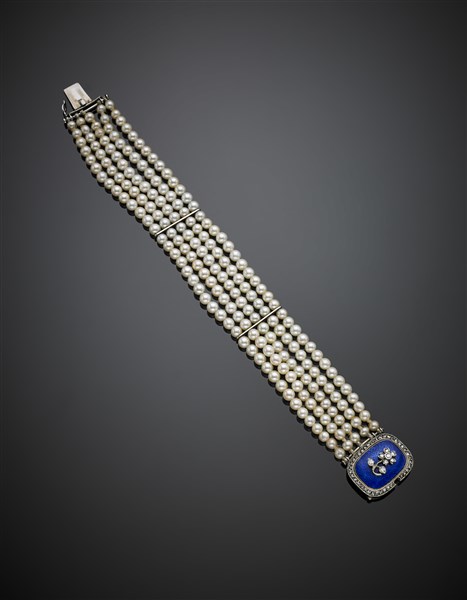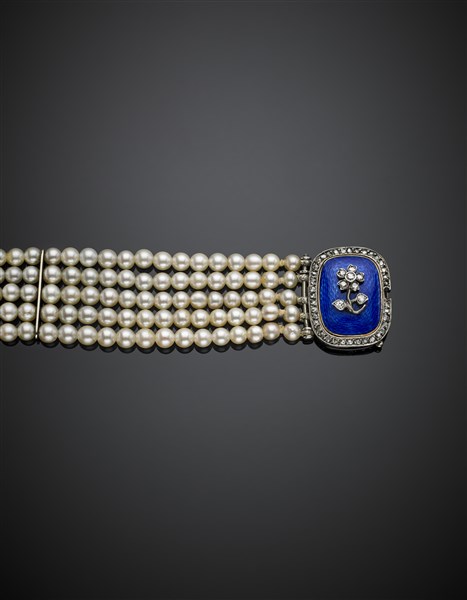 Five strand mm 3.50-4.20 cultured pearl bracelet with bi-coloured gold, blue guilloché enamel and diamond clasp, white gold spacers g 26.45 circa, length cm 18 circa.