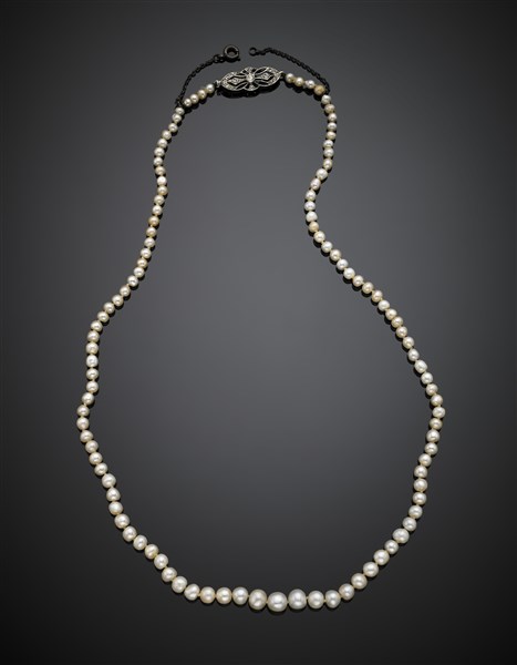 Collier a scalare a un filo di perle coltivate da mm 3 a mm 5,75 circa con chiusura in oro bianco e diamanti, sicurezza in argento, g 10,70 circa, lungh. cm 44,70 circa.