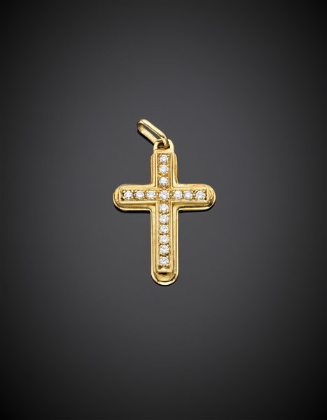Croce pendente in oro giallo e diamanti per complessivi ct. 0,50 circa, g 5,90 circa, lungh. cm 3,90 circa. Firmata e marcata Steli, 466 MI.