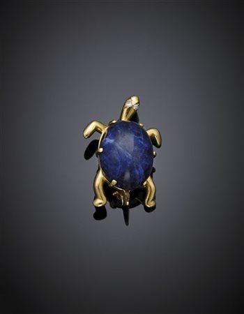 Spilla tartaruga in oro giallo e sodalite, pietre incolori per gli occhi, g 7,80 circa, lungh. cm 3,40 circa. Firmata Gucci.