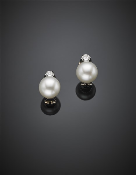 White mm 12.70 circa cultured pearl and diamond in all ct. 0.85 circa white gold earclips, g 12.10 circa.