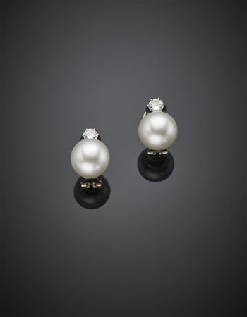 Orecchini in oro bianco con perle bianche di mm 12,70 circa e due diamanti per complessivi ct. 0,85 circa, g 12,10 circa.