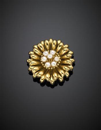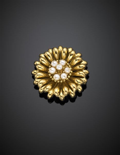 Spilla a fiore in oro giallo con perle, g 20,45 circa, diam. cm 4,40 circa. Fir