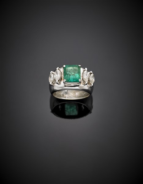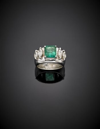Anello in oro bianco con quattro diamanti a navette per complessivi ct. 1,20 circa e uno smeraldo ottagonale di ct. 3,10 circa, g 9,50 circa misura 17/57.