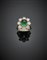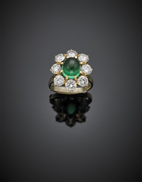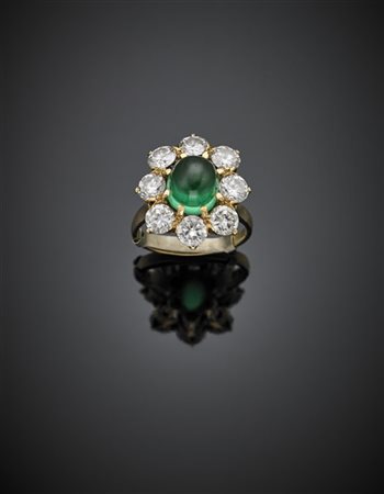 Anello in oro giallo a fiore con otto brillanti per complessivi ct. 3,20 circa e doppietta verde cabochon, con contranello in metallo, lordi g 7,30 circa misura 13/53.