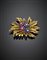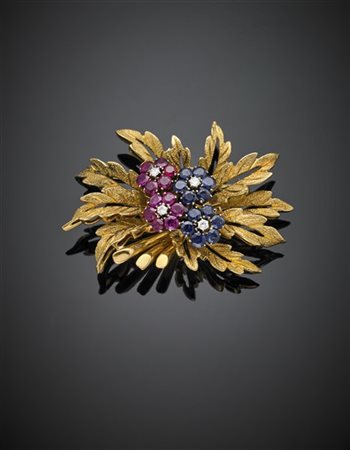 Spilla in oro giallo cesellato a mazzo di fiori e foglie rifinita in zaffiri, r
