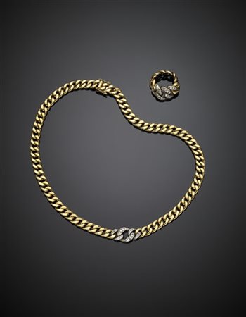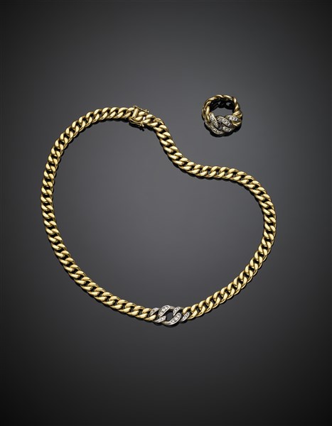 Demi parure in oro giallo e bianco composta da girocollo e anello a maglia groumette, le maglie centrali rifinite in diamanti, complessivi g 52,50 circa, lungh. cm 39,40 circa misura 14/54. il collier marcato CB.