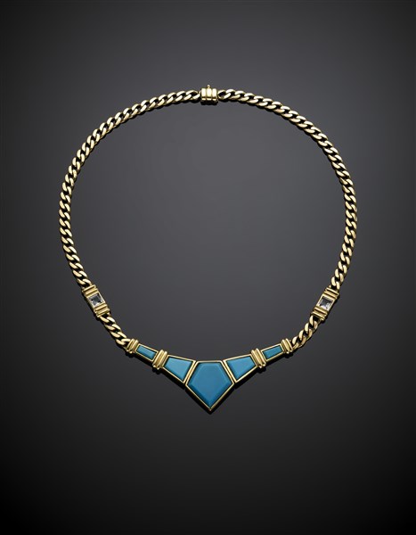 Collier a maglia groumette in oro giallo con centrale in turchese ricostituito e acquamarine carré nei distanziatori, g 37,90 circa, lungh. cm 39,50 circa.