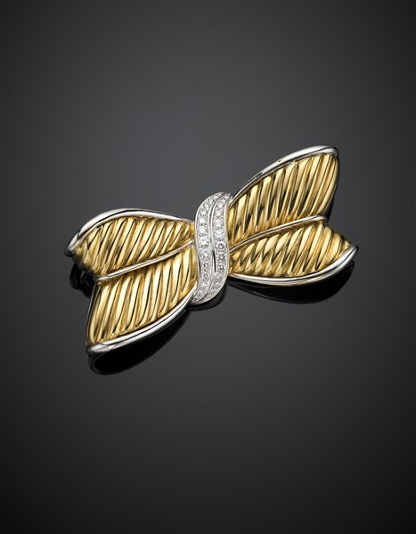 Spilla a fiocco in oro giallo e bianco con diamanti per complessivi ct. 1 circa