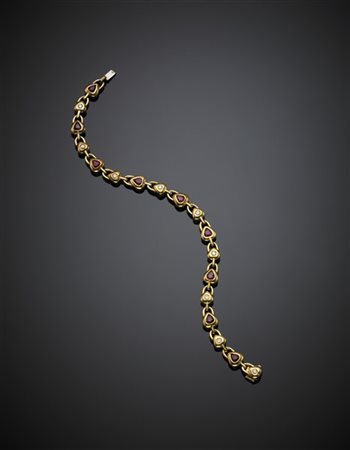 Pear ruby and round diamond yellow gold modular bracelet, g 24.40 circa, length cm 19.50 circa.