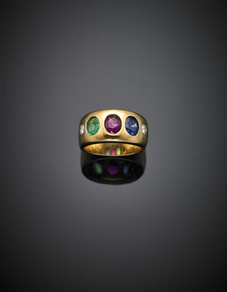 Anello a fascia in oro giallo con un rubino, uno zaffiro ed uno smeraldo ovali