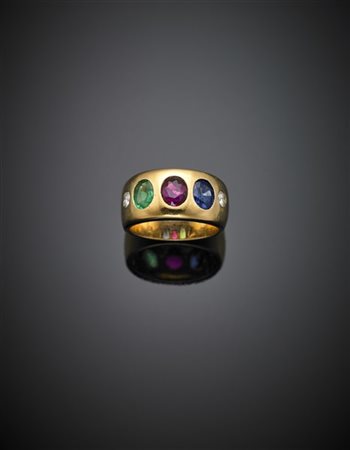 Anello a fascia in oro giallo con un rubino, uno zaffiro ed uno smeraldo ovali e rifinito con due diamanti, g 12,20 circa misura 12/52.