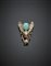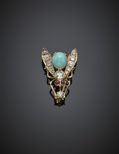 Spilla a guisa di mosca in oro giallo, diamanti old mine per complessivi ct. 1,90 circa, turchese e rubini cabochon per gli occhi, g 5,70 circa, lungh. cm 2,90 circa.