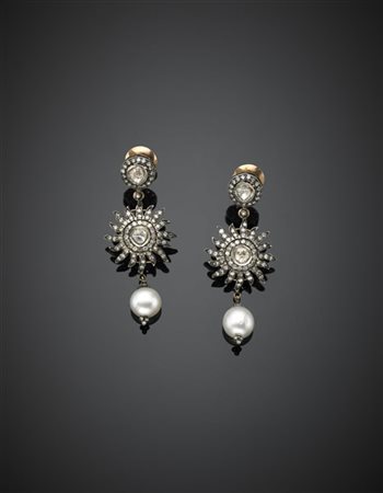 Silver and 9K gold pendant earrings with irregular diamonds holding two pearls of mm 8.90 circa, g 12.80 circa, length cm 5.20 circa. (losses).