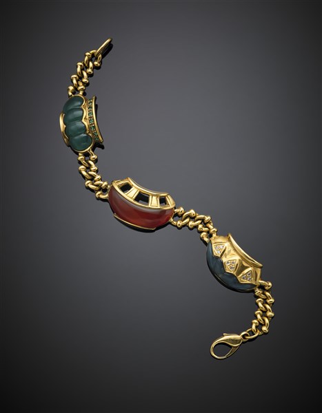 *Bracciale in oro giallo con distanziatori a guisa di vasi in pietre dure e dia