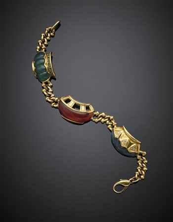 *Yellow gold bracelet with hardstone vase spacers, accented with diamonds, g 24.50 circa, length cm 16.60 circa. (slight defects)