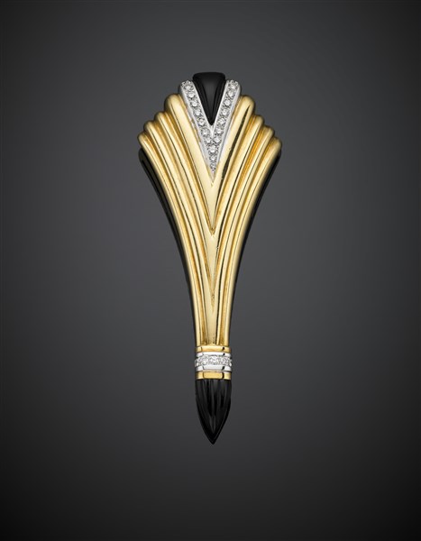 Spilla in oro giallo e bianco con onice scolpita e diamanti, g 28,40 circa, lungh. cm 9,60 circa. Firmata e marcata Alvestile, 927 MI.