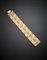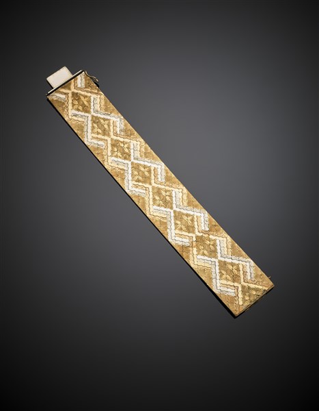 Bracciale piatto in oro giallo, bianco e rosso in parte cesellato, g 85 circa, lungh. cm 18,80, h cm 3,10 circa. Marcato 163V.