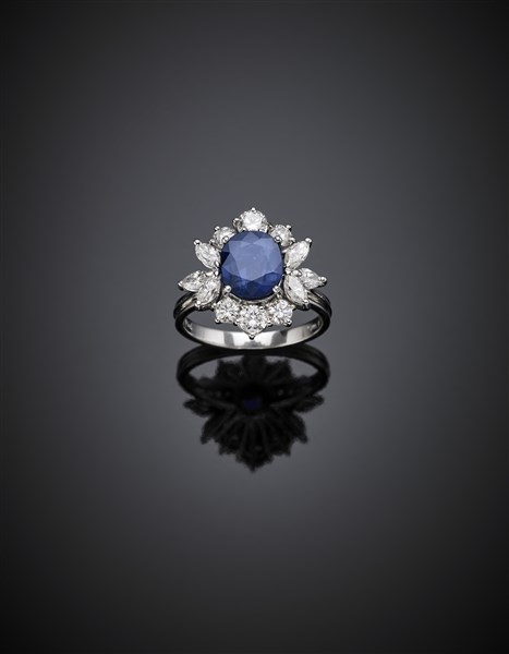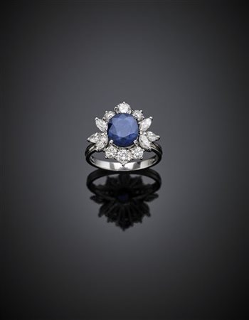 Anello in oro bianco con zaffiro a cuscino di ct. 2,40 circa e diamanti rotondi e a navette per complessivi ct. 1,30 circa, g 5,30 circa misura 14/54.