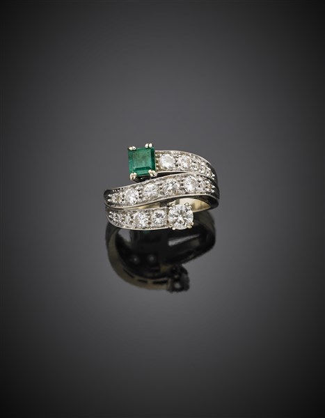 Graduated diamond and step cut emerald bi-coloured gold ring, diamonds in all ct. 3.10 circa, g 11.10 circa size 21/61.