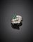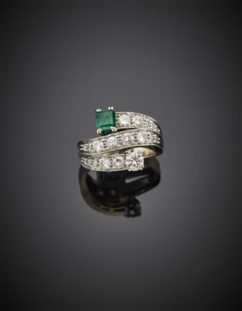 Anello in oro bianco e giallo con diamanti rotondi per complessivi ct. 3,10 circa e smeraldo ottagonale, g 11,10 circa misura 21/61.