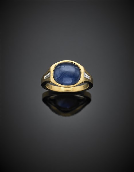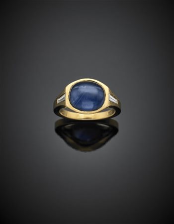 Anello in oro giallo con zaffiro cabochon di ct. 4,80 circa con due diamanti tapered, g 6,50 circa misura 13/53.