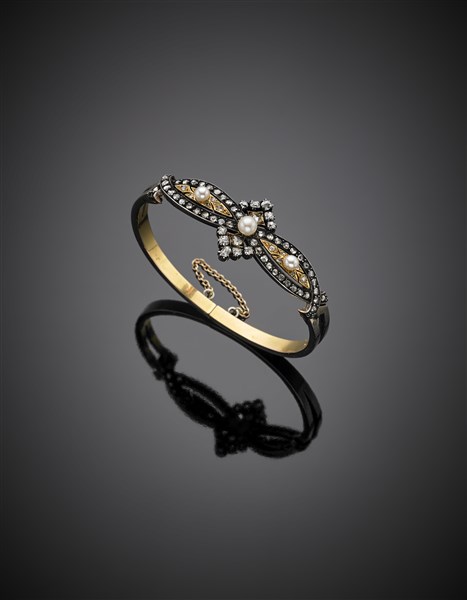 Bracciale rigido in oro giallo e argento, diamanti e perle, g 25,00 circa, diam. cm 6 circa. (lievi difetti)