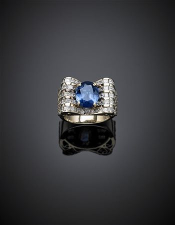 Oval ct. 5 circa sapphire with round and carré diamond yellow gold ring, g 15.80 circa size 17/57.