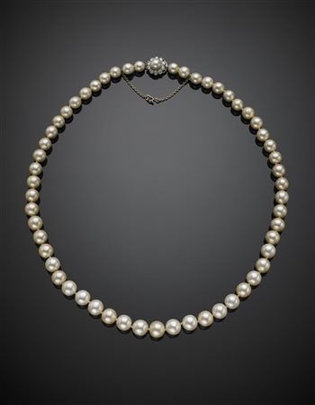 Cultured graduated pearl necklace with pearl and diamond white gold cluster clasp, pearl from mm 7.70 to mm 10.55 circa, diamond in all ct. 1 circa, g 70.20 circa, length cm 57.50 circa.