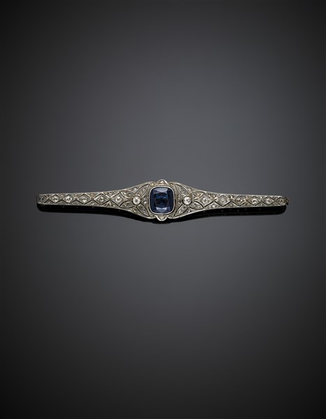 Platinum and gold diamond brooch centered by a blue paste, g 17.80 circa, length cm 12.60 circa.