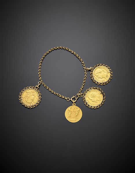 Bracciale in oro giallo con tre monete e una medaglia a charm, g 42,90 circa, lungh. cm 19,50 circa. (lievi difetti)