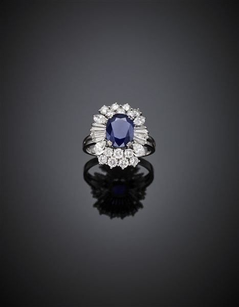 Anello in oro bianco con zaffiro ovale di ct. 2 circa, diamanti rotondi, a navette e tapered per complessivi ct. 1,80 circa, g 5,20 circa misura 13,5/53,5.