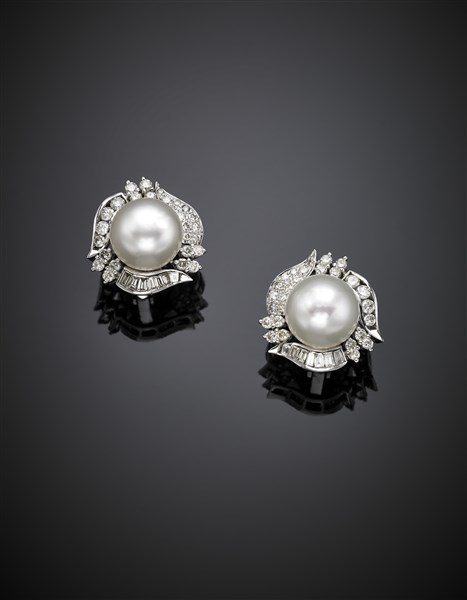 Round marquise and tapered diamond with mm 13.20 circa australian pearl white gold earclips, diamonds in all ct. 3.50 circa, g 22.40 circa, diam. cm 2.20 circa.