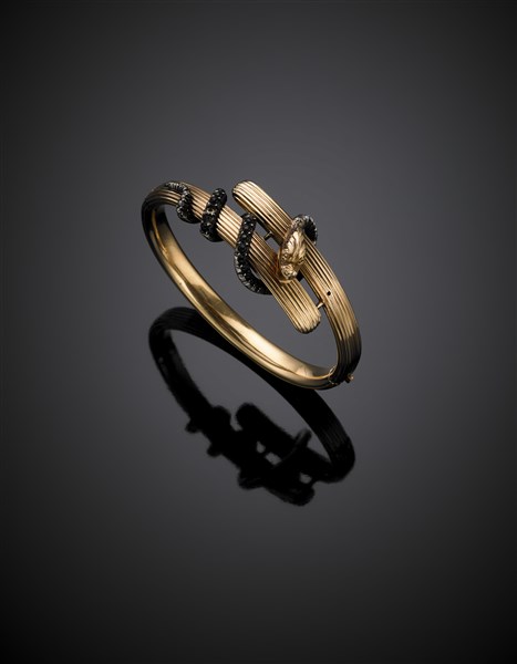 Yellow gold grooved bangle with snake accented in silver, onyx and pearls, g 23.30 circa, diam. cm 6 circa. (defects and losses)