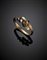 Bracciale rigido in oro giallo rigato con serpente rifinito in argento, perle e onice, g 23,30 circa, diam. cm 6 circa. (difetti e mancanze)