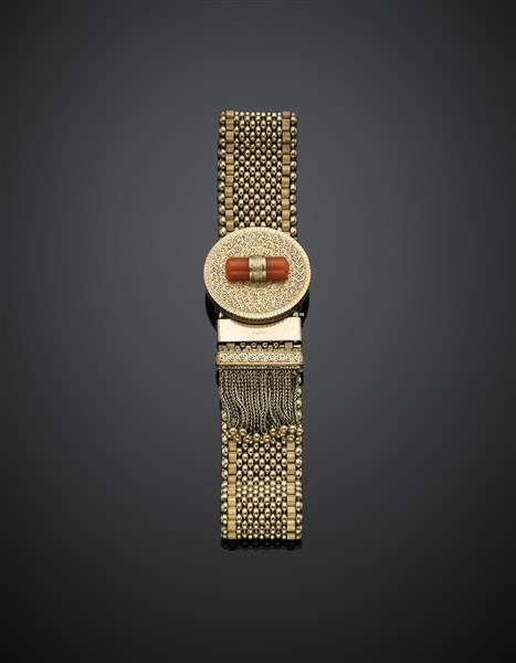 Yellow 9K gold supple band bracelet with buckle and tassel, coral detail, inscribed inside H E Churchill, g 47.57 circa, diam. cm 7.50 circa. With original case (slight defects)