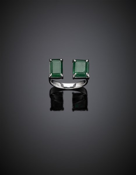 Anello in oro bianco con due smeraldi a gradini per complessivi ct. 3,10 circa, g 4,80 circa misura 14/54.