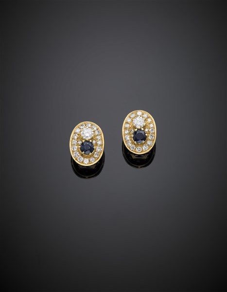 Orecchini in oro giallo, diamanti e zaffiri, diamanti per complessivi ct. 1 circa di cui i due centrali di ct. 0,30 circa ognuno, g 8,60 circa, lungh. cm 1,60 circa.