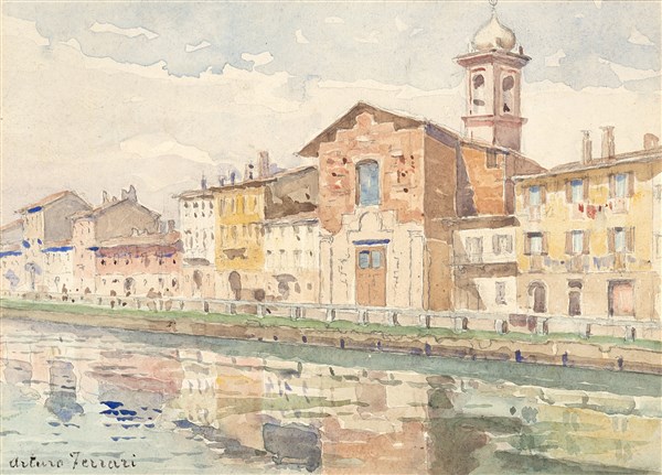 Arturo Ferrari "Santa Maria al Naviglio" acquerello su carta (cm 21x29) Firmato