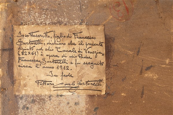Al retro: cartiglio con iscrizione per autentica del figlio Carlo Sartorelli