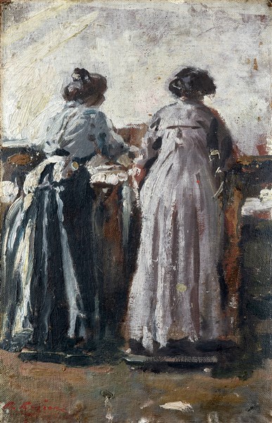 Raffaele Ragione "Le lavandaie" olio su tela applicata a cartone (cm 35x21,5) F