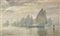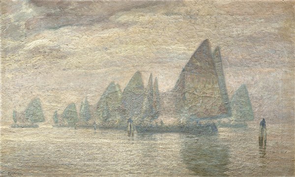 Ugo Flumiani "Calma. Laguna di Grado" olio su tela (cm 70x116) Firmato in basso