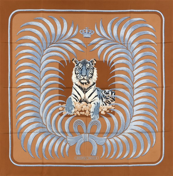 HERMÈS Foulard in seta "Tigre Royal", Christiane Vauzelles 1977 fondo e bordo