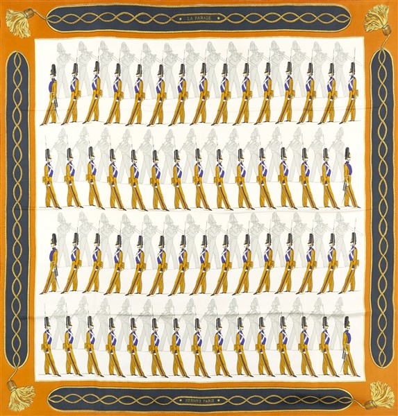 HERMÈS Foulard in seta "La Parade" Françoise Héron 1966 fondo bianco bordo rug