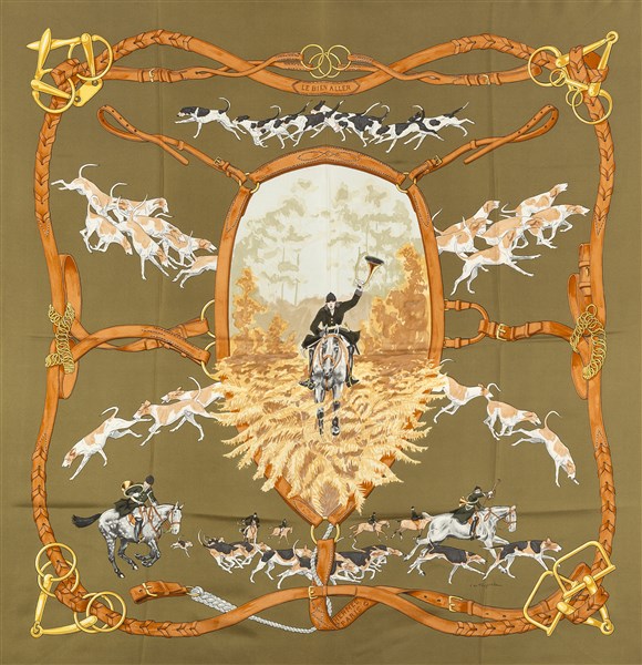 HERMÈS Foulard in seta "Le Bien Aller", Jean de Fougerolles 1979, fondo verde