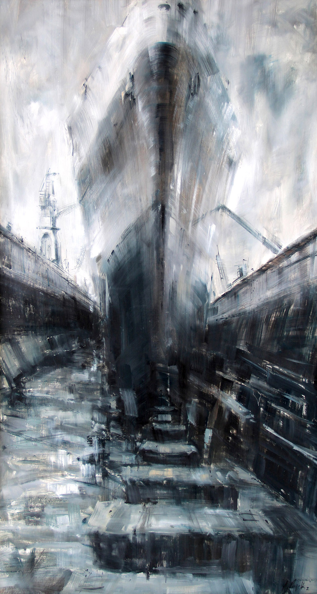 PAPETTI Alessandro, Bacino di carenaggio 2002 olio su tela cm. 205 x 112, . Autentica dell'artista su fotografia . Firma "A. Papetti" (in basso a destra)