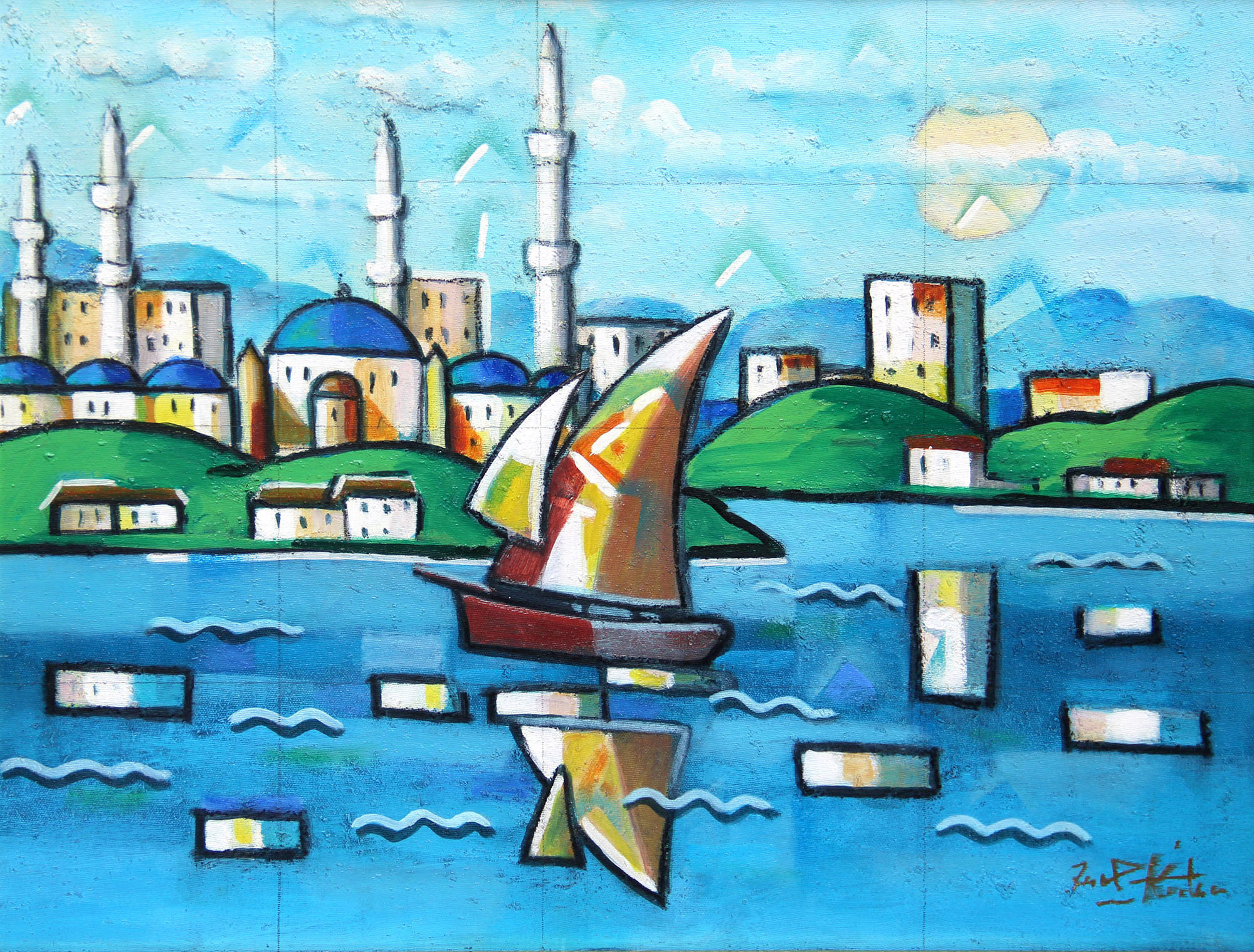 Firma, data, titolo, tecnica, misure, numerazione "Ibrahim Kodra, 86, Istanbul, olio T.M., 50x70, P-15" (al retro)