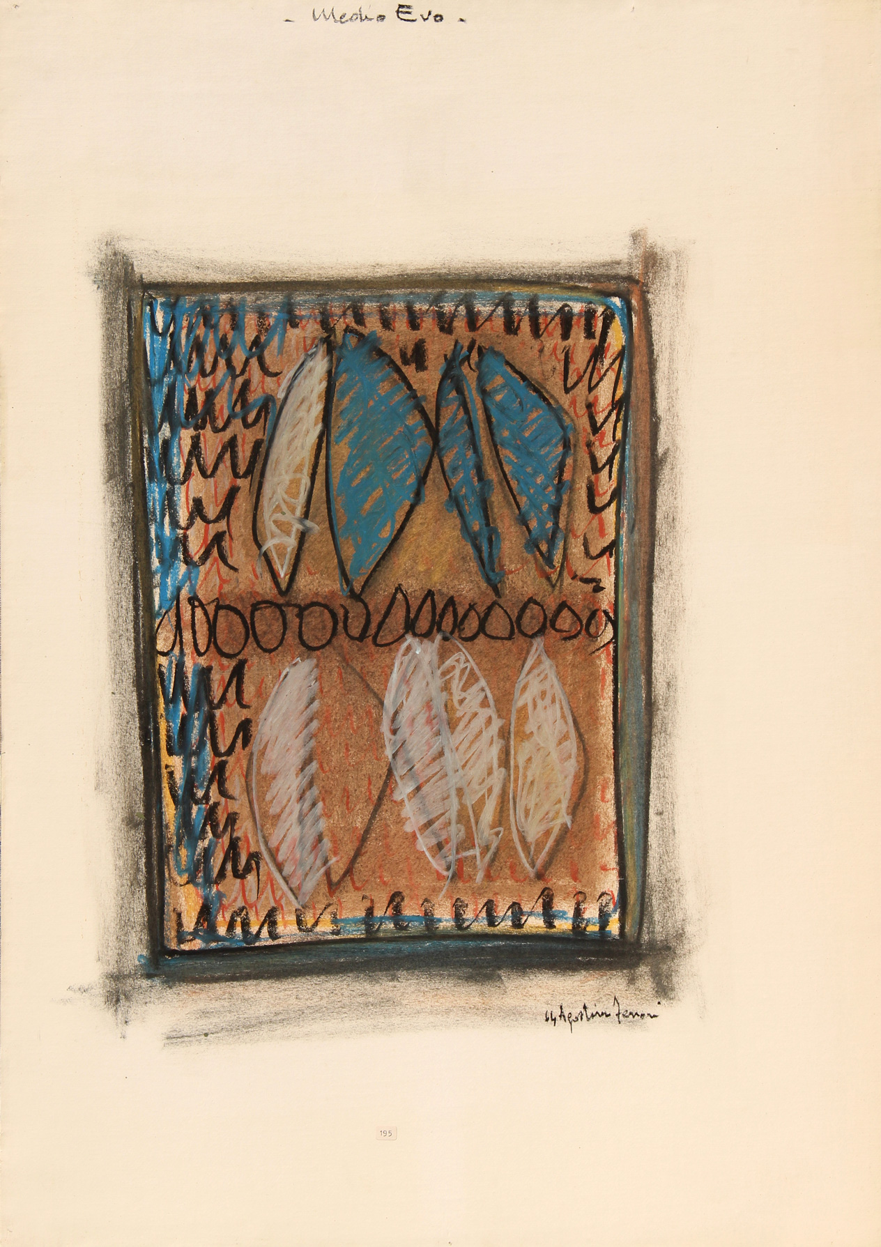 FERRARI Agostino, Medio Evo 1964 tecnica mista su carta intelata cm. 70 x 50, M. Corgnati, "Agostino Ferrari Catalogo generale", Electa, Milano, 2018, p. 209. Autentica dell'artista su fotografia in data 07/07/2003. Titolo "Medioevo" (in alto al centro)