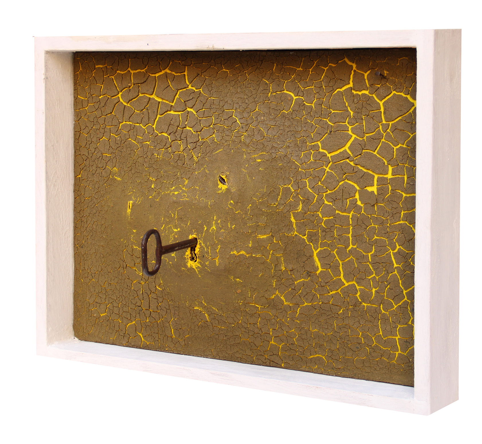 PANICO Roberto, La chiave è ancora li...entrate pure 2018 tecnica mista su tavola cm. 48 x 62.5, . . Titolo, firma, data, scritta "La chiave è ancora li...entrate pure, Panico, 08-2018, nello scrigno di ognuno 07-2019 di segreti e novità" (al retro)