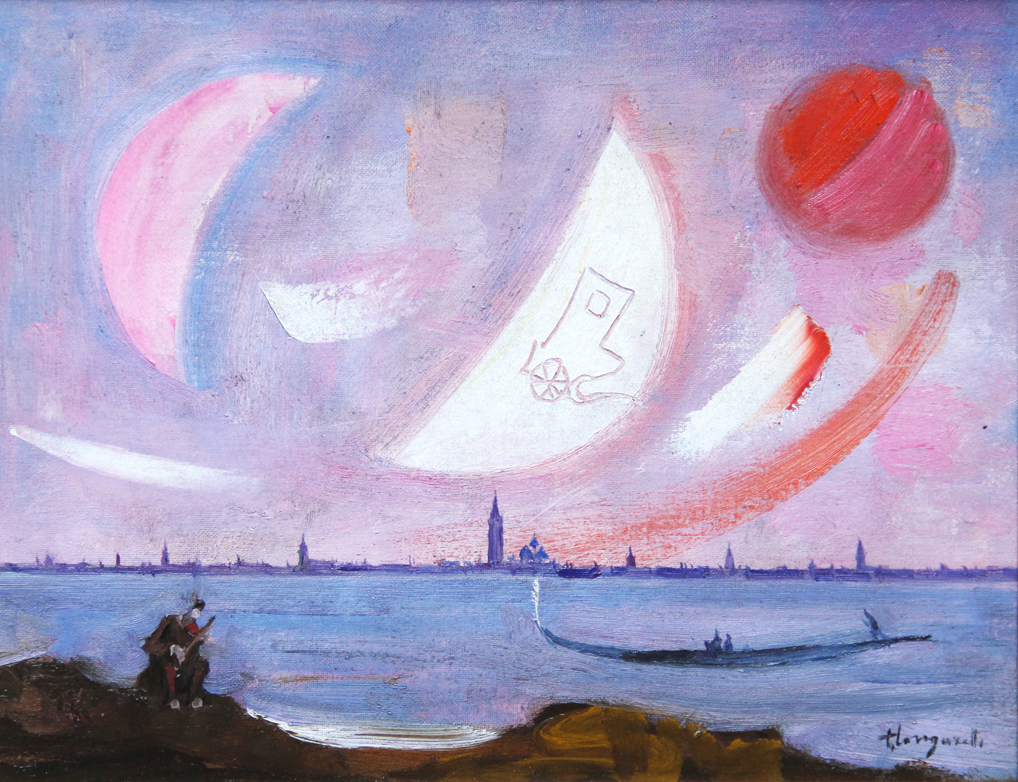 LONGARETTI Trento, La grande luna bianca a Venezia 1985 olio su tela cm. 30 x 40, . Autentica dell'artista su fotografia in data 15/01/2001. Firma "T. Longaretti" (in basso a destra)
